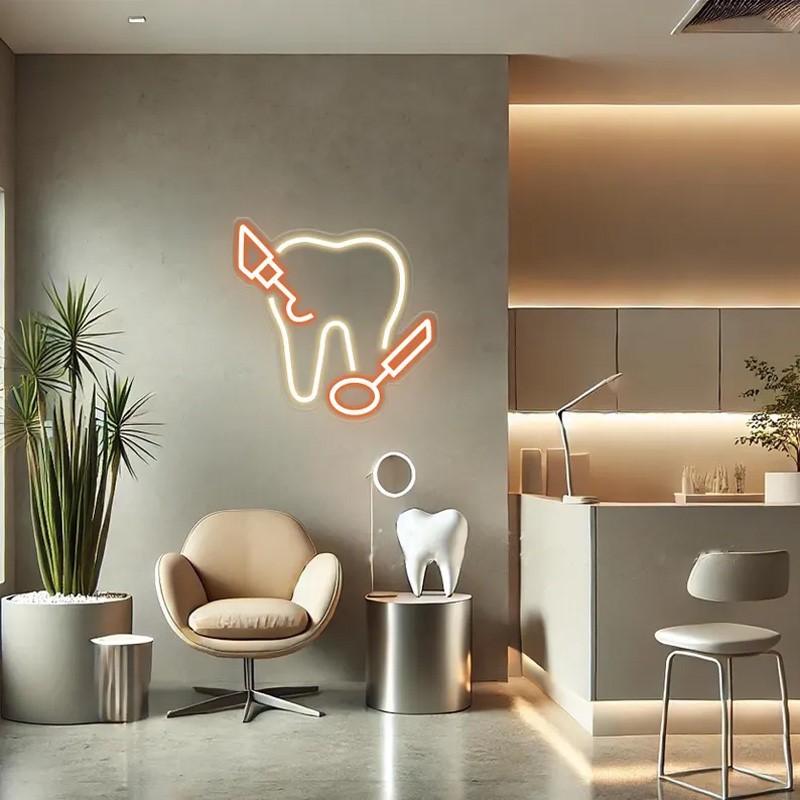 استفاده از نئونهای رنگ سفید و یا آبی ملایم برای تابلو مطب، نور پسزمینه لوگو و یا طراحی بخش پذیرش باعث میشود محیط آرام و لوکس بهنظر برسد.