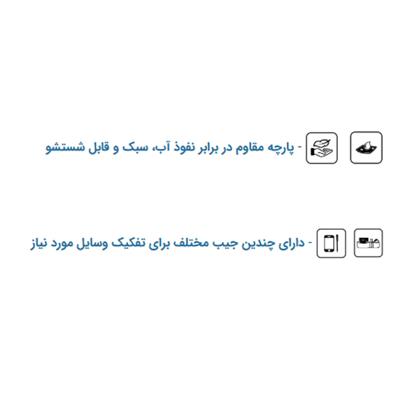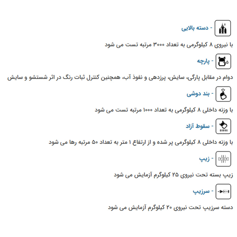 استفاده از پارچههای مقاوم در برابر سایش، پارگی و رطوبت، باعث شده این کوله ها در برابر انواع شرایط مختلف محیطی مثل باران، گرد و غبار یا فشار فیزیکی، عملکرد مناسبی و ایده آلی داشته باشند. همچنین داشتن کیفیت بالای دوخت ها و زیپ ها، طول عمر بالا و دوام این محصول را در استفاده های طولانی مدت تضمین میکند.