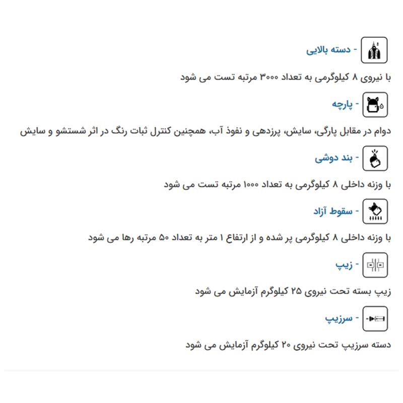 استفاده از پارچههای مقاوم در برابر سایش، پارگی و رطوبت، باعث شده این کوله ها در برابر انواع شرایط مختلف محیطی مثل باران، گرد و غبار یا فشار فیزیکی، عملکرد مناسبی و ایده آلی داشته باشند. همچنین داشتن کیفیت بالای دوخت ها و زیپ ها، طول عمر بالا و دوام این محصول را در استفاده های طولانی مدت تضمین میکند.